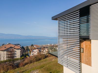 EVIAN SOTHEBY'S INTERNATIONAL REALTY vous propose en exclusivité : Rare à la vente, à 5 minutes du centre ville, du debarcadère et du port de plaisance à pieds, une villa d'architecte récente (2018) sur 3 niveaux avec une vue à 180° exceptionnelle sur le lac face à Lausanne. D'une superficie habitable de 135 m2 sur une parcelle de 704 m2 cette villa comprend : une cuisine équipée ouverte sur un grand séjour de 55 m2 donnant accès à deux terrasses (N et N/S/E), un bureau, trois chambres en suite (avec chacune une salle d'eau/wc), un wc visiteur avec douche, un espace couchage lit superposé, un garage à voiture avec une buanderie. Parking. Très belles prestations récentes et contemporaines.